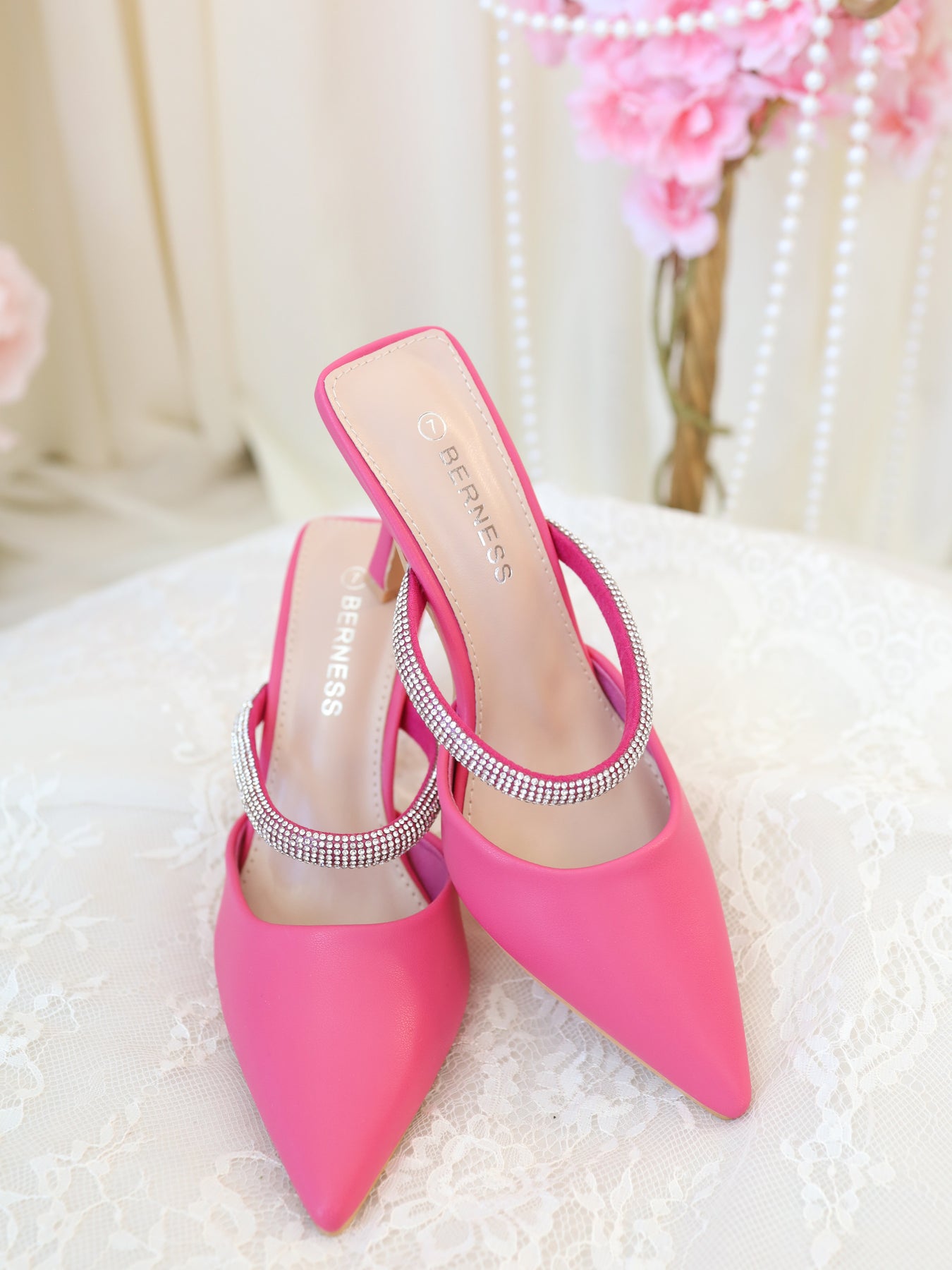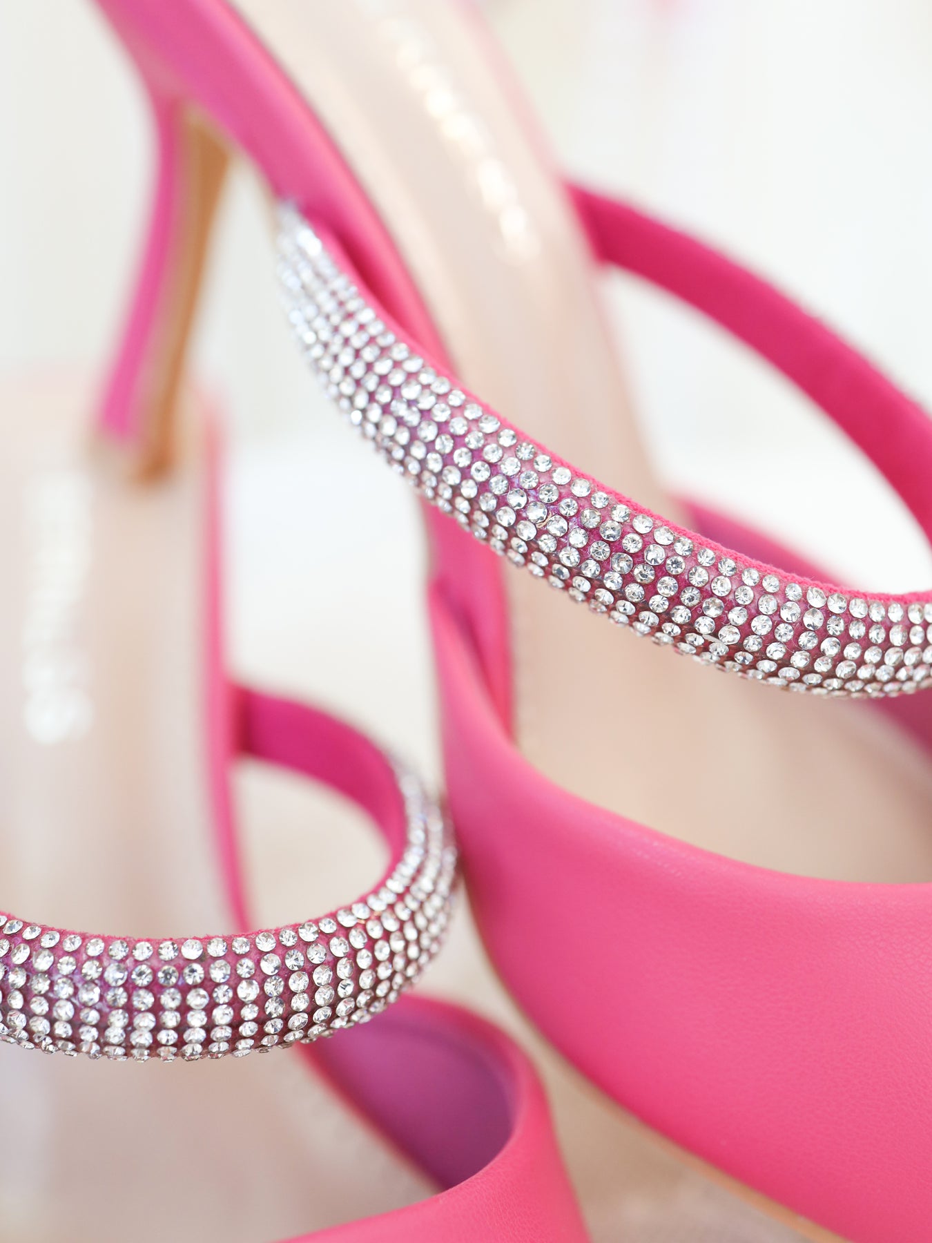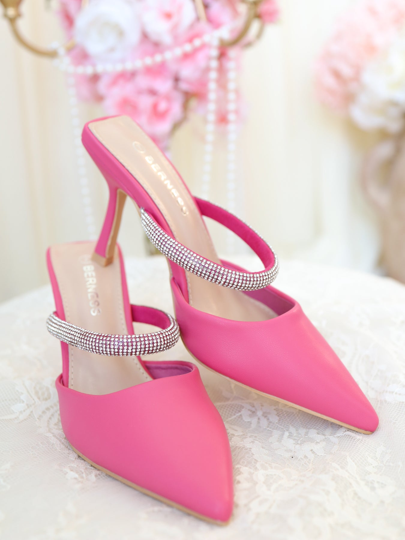 Elevate your style with these fun barbie pink heels, featuring a sparkly crystal mesh strap. Perfect for adding a touch of glamour to any outfit. These heels are a must-have for any fashion-forward individual. Stand out from the crowd with our Katherine Heels in Pink!